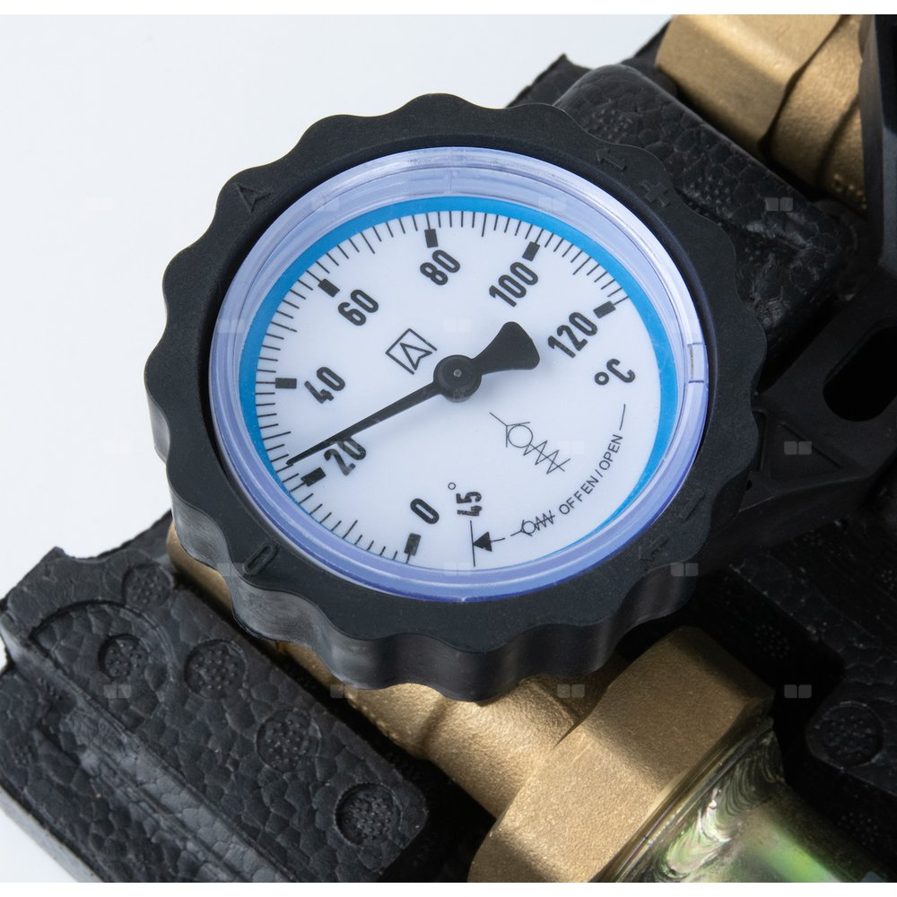 Wyposażona w niezbędne komponenty: termometry, zawór zwrotny, zawory odcinające na zasilaniu i powrocie i izolację termiczną.