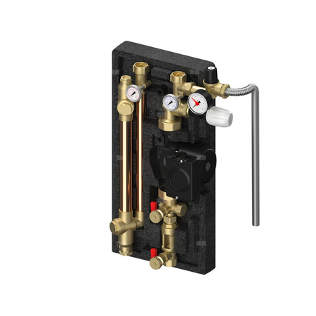 100% wykluczenie cyrkulacji grawitacyjnej. Zintegrowany separator powietrza. Różne możliwości podłączenia naczynia wzbiorczego. Składa się z: pompy obiegowej (DN 25, EL 180 mm), zaworu regulacyjnego i siłownika termicznego ze wskazaniem położenia; zintegrowanego separatora powietrza, dwóch termometrów kontaktowych; grupy bezpieczeństwa (TÜV) z zaworem bezpieczeństwa (6 bar), manometru (0-10 bar), dwóch zaworów kulowych napełniająco-spustowych łącznie z końcówkami na wąż i korkami, rotametru (z dwoma skalami: dla wody i glikolu) z regulacją objętości strumienia, zaworu odcinającego do pompy z możliwością podłączeniem dla naczynia wyrównawczego po stronie ssącej pompy, 2-częściowej izolacji EPP (specjalna konstrukcja do montażu ściennego wraz z wkrętami).