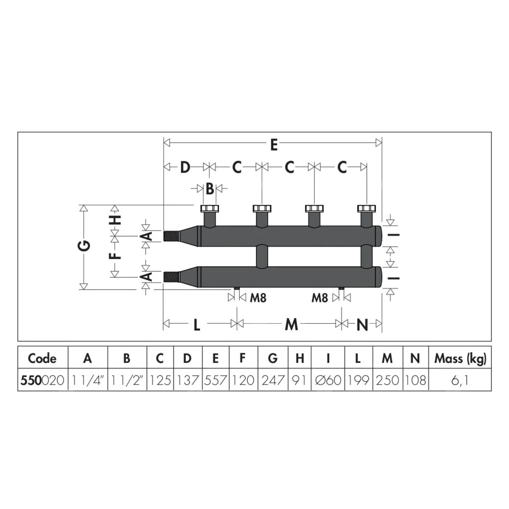 Rozdzielacz do instalacji grzewczych i chłodniczych. Wykonany ze stali.