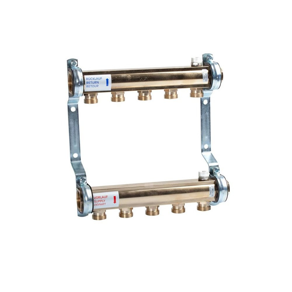 Rozdzielacz 1” do instalacji grzewczych, wykonany z profilowanych kolektorów mosiężnych, zamontowany na dźwiękochłonnych wspornikach, z możliwością podłączenia z dwóch stron (gwint wewnętrzny 1” z uszczelką). Podłączenia do rur obwodowych: gwint zewn. 3/4” do złączki z euro - stożkiem. Rozstaw króćców: 50 mm. Produkt po próbach hydraulicznych. Kolektory wyposażone w odpowietrzniki i w dwie zaślepki.