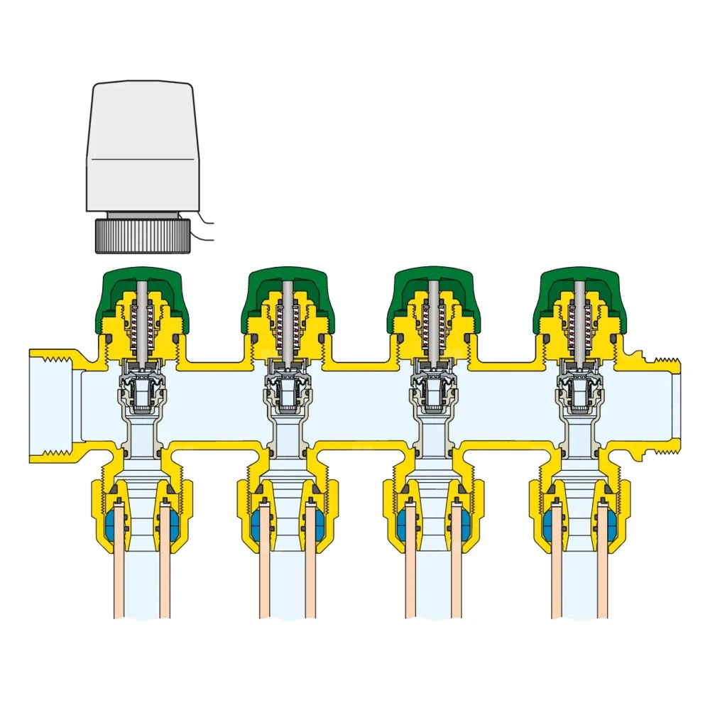 Zespół rozdzielaczy Zawiera: - rozdzielacz powrotny z wkładkami równoważącymi DYNAMICAL® przystosowanymi do współpracy z siłownikami elektrotermicznymi, zakres regulacji 25÷170 l/h; - rozdzielacz zasilania z przepływomierzami; - zakończenie rozdzielacza z automatycznym odpowietrznikiem z kapturkiem higroskopijnym i zaworem spustowym; - stalowe uchwyty montażowe do zastosowania w skrzynkach lub bezpośrednio na ścianie. główne podłączenie: G 1" (ISO 228-1) GW, Podłączenie do złączek Caleffi. przyłącza wylot: G 3/4" A (ISO 228-1) GZ, 10 wyjść. Maksymalne ciśnienie pracy: 6 bar. Zakres temperatury medium: 5–60 °C. Rozstaw wyjść: 50 mm. Zakres regulacji natężenia przepływu: 25–150 l/h.