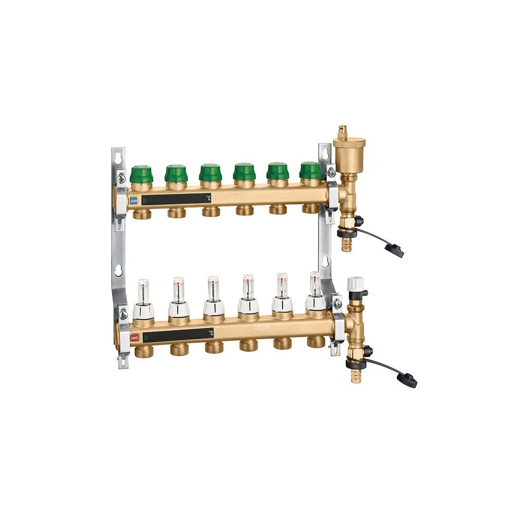 Zespół rozdzielaczy Zawiera: - rozdzielacz powrotny z wkładkami równoważącymi DYNAMICAL® przystosowanymi do współpracy z siłownikami elektrotermicznymi, zakres regulacji 25÷170 l/h; - rozdzielacz zasilania z przepływomierzami; - zakończenie rozdzielacza z automatycznym odpowietrznikiem z kapturkiem higroskopijnym i zaworem spustowym; - stalowe uchwyty montażowe do zastosowania w skrzynkach lub bezpośrednio na ścianie. główne podłączenie: G 1" (ISO 228-1) GW, Podłączenie do złączek Caleffi. przyłącza wylot: G 3/4" A (ISO 228-1) GZ, 11 wyjść. Maksymalne ciśnienie pracy: 6 bar. Zakres temperatury medium: 5–60 °C. Rozstaw wyjść: 50 mm. Zakres regulacji natężenia przepływu: 25–150 l/h.