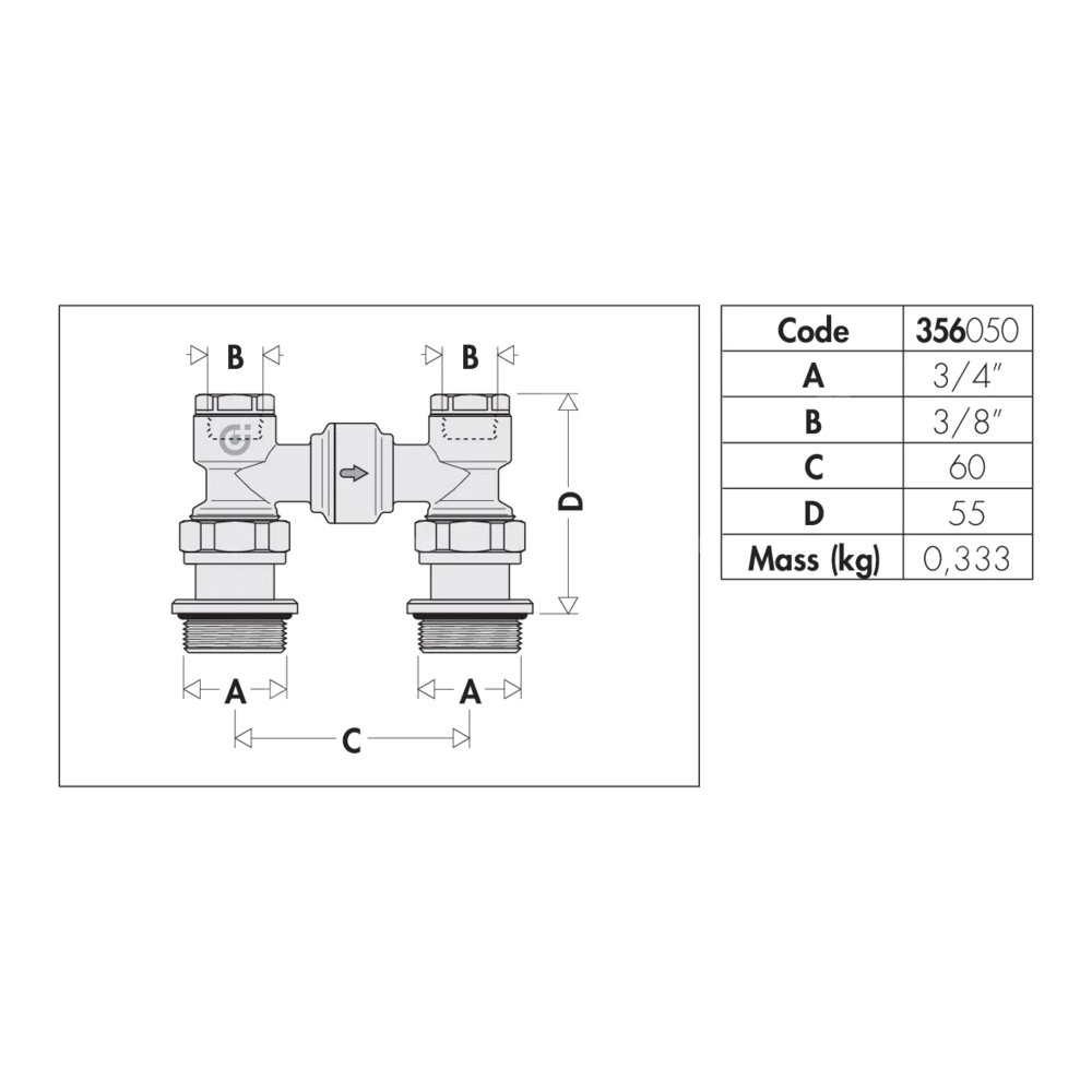 Obejście różnicowe dla rozdzielaczy podwójnych serii 356 i 357. Przyłącze 3/8" do automatycznych zaworów odpowietrzających Przyłącze: G 3/4" A (ISO 228-1) GZ, Podłączenie do złączek Caleffi. Maksymalne ciśnienie pracy: 10 bar. Zakres temperatury medium: -10–110 °C. Stała nastawa ciśnienia różnicowego: 20 (2000 mm c.a.) kPa.