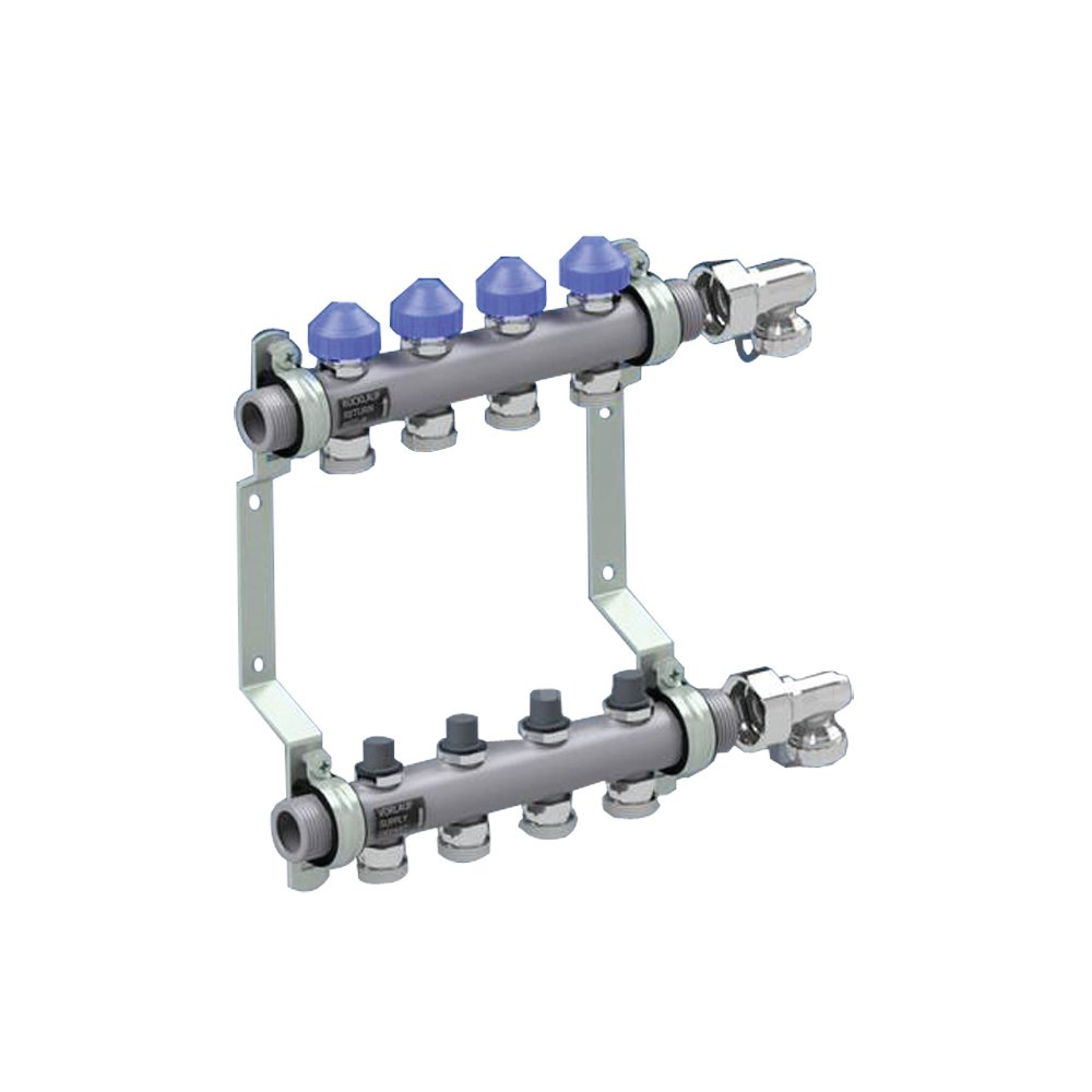 Rozdzielacz ze stali nierdzewnej zgodny z normą EN 1264-4. Obustronnie przyłącze płaskouszczelniane