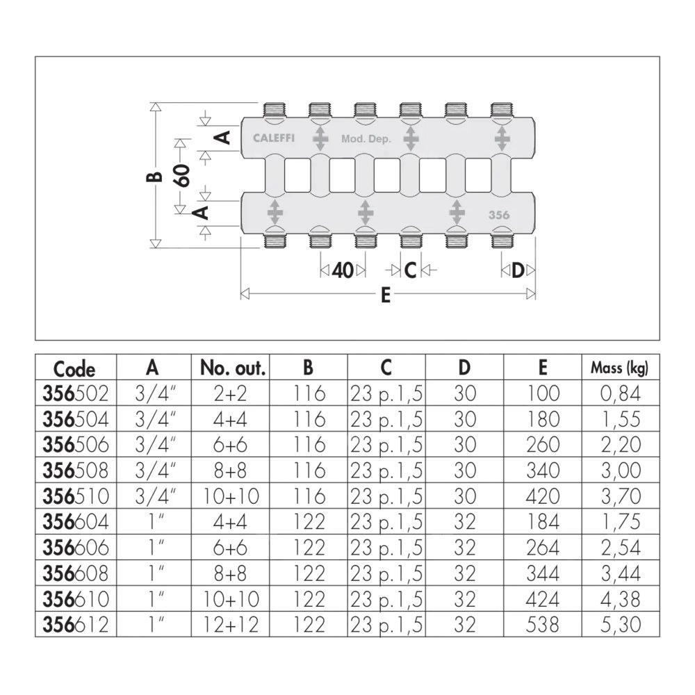 Rozdzielacz podwójny - monoblok Dla instalacji grzewczych i chłodniczych. Przyłącze: G 3/4" (ISO 228-1) GW, Podłączenie do złączek Caleffi. przyłącza wylot: 23 p.1,5, 4 wyjścia. Maksymalne ciśnienie pracy: 10 bar. Zakres temperatury medium: 10–110 °C. Rozstaw przyłączy głównych: 60 mm. Rozstaw wyjść: 40 mm.