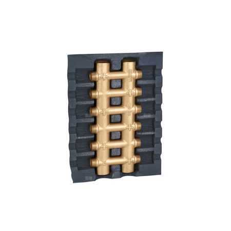 Rozdzielacz podwójny - monoblok Z izolacją. Dla instalacji grzewczych i chłodniczych. Przyłącze: G 1" (ISO 228-1) GW, Podłączenie do złączek Caleffi. przyłącza wylot: 23 p.1,5, 4 wyjścia. Maksymalne ciśnienie pracy: 10 bar. Zakres temperatury medium: 0–100 °C. Rozstaw przyłączy głównych: 60 mm. Rozstaw wyjść: 40 mm.