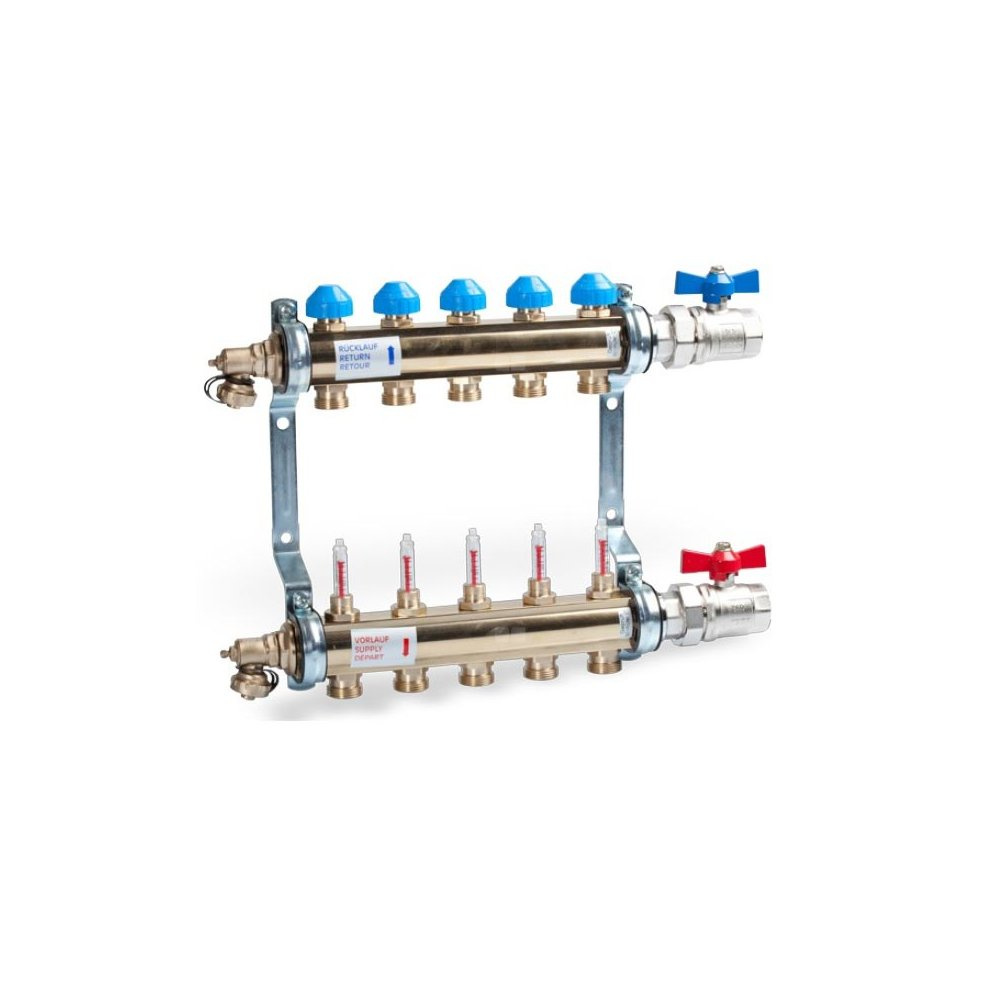 Kolektor ogrzewania obwodu pręta mosiężnego według EN 1264-4. Połączenia uszczelniające płaskie 1 ”f. Niska głębokość instalacji. Sutek połączenia G 3/4 ”z eurocone, odległość 50 mm. Przetestowane funkcje i ciśnienie. Ukończone z zestawami końcowymi. Dostawa: Flowmeter 0 - 6 l/min z funkcją spadku niskiego ciśnienia i funkcją odcięcia. Powrót: Zawór sterujący i odcinający z adaptacją M30 x 1,5. Ukończone z zestawami zaworów kulowych AS25