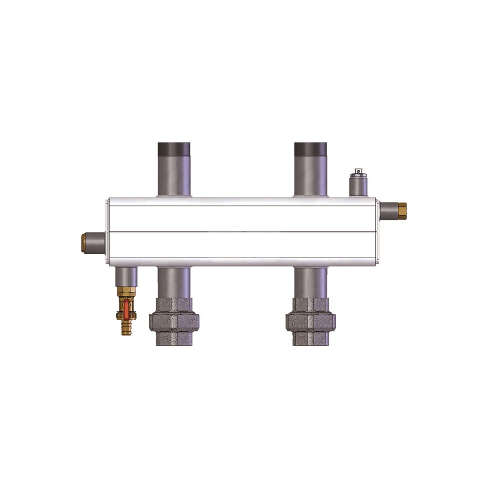 Do montażu w poziomie, lub w pionie, z manualnym odpowietrznikiem i zaworem spustowym ze złączką do węża i kapą, tuleja zanurzeniowa 3/8" GW (średnica wewnętrzna 10 mm) do czujnika temperatury na zasilaniu, przyłącza gwintowe 1 1/2" GZ (góra) i śrubunki 1 1/2" GW (obieg kotłowy), komplet z izolacją.