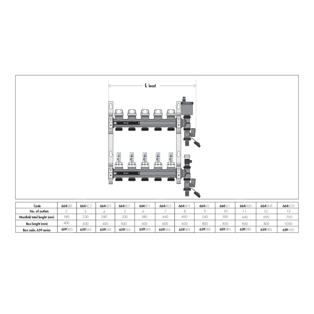 Zespół rozdzielaczy Zawiera: - rozdzielacz powrotny z wbudowanymi zaworami odcinającymi do siłownika termoelektrycznego; - rozdzielacz zasilający z przepływomierzami o skali 0-5 l/min i zaworami regulacyjnymi; - zakończenia rozdzielacza z automatycznym zaworem odpowietrzającym i zaworem spustowym; - uchwyty montażowe z technopolimeru z regulowaną odległością od środka do użycia ze skrzynkami serii 659 lub do bezpośredniego mocowania na ścianie. główne podłączenie: G 1" (ISO 228-1) GW, Podłączenie do złączek Caleffi. przyłącza wylot: G 3/4" A (ISO 228-1) GZ, 11 wyjść. Maksymalne ciśnienie pracy: 6 bar. Zakres temperatury medium: 5–60 °C. Rozstaw wyjść: 50 mm. Zakres regulacji natężenia przepływu: 0–5 l/min.