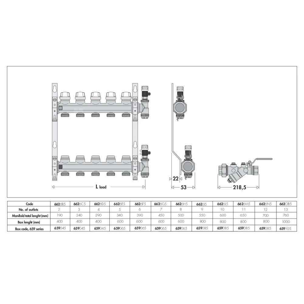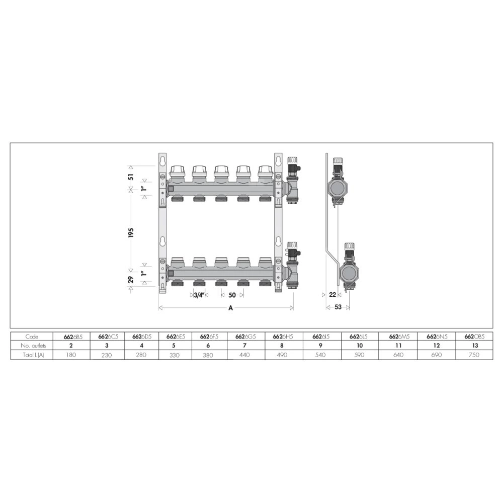 Zespół rozdzielaczy. Zawiera: -rozdzielacz powrotny z zaworami odcinającymi z możliwością przyłączenia siłownika termoelektrycznego; - rozdzielacz zasilający z zaworami do wstępnej regulacji natężenia przepływu; - zakończenia rozdzielacza z ręcznymi zaworami odpowietrzającymi i korkami; - uchwyty montażowe z polimeru z możliwością regulacji rozstawu do użycia ze skrzynką serii 659 lub 661 lub do montażu bezpośrednio na ścianie. Przyłącze: G 1" (ISO 228-1) GW, Podłączenie do złączek Caleffi. przyłącza wylot: G 3/4" A (ISO 228-1) GZ, 8 wyjść. Maksymalne ciśnienie pracy: 10 bar. Zakres temperatury medium: 5–100 °C. Rozstaw wyjść: 50 mm.