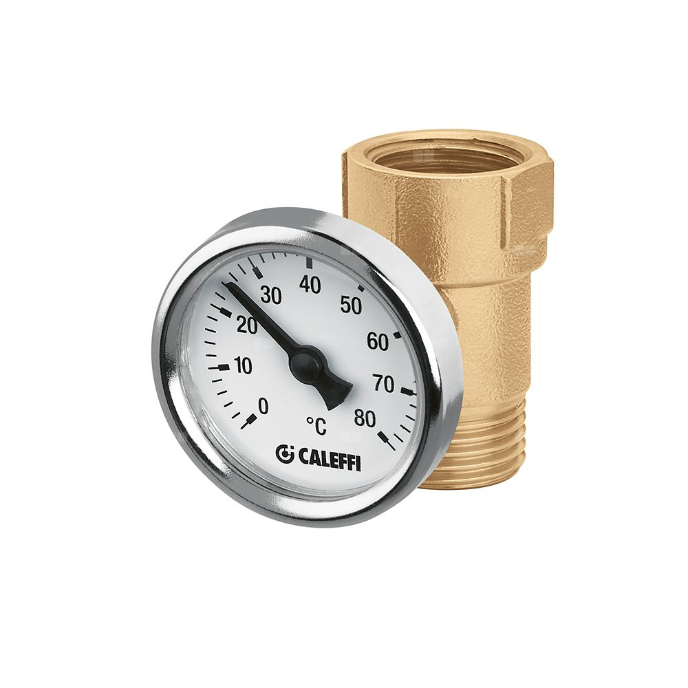 Złączka z termometrem. Przyłącze: G 1/2" A (ISO 228-1) GZ, wlot. Przyłącze: G 1/2" (ISO 228-1) GW, wylot. Wymiary/ Średnice: Ø 40 mm. Skala termometru: 0–80 °C.