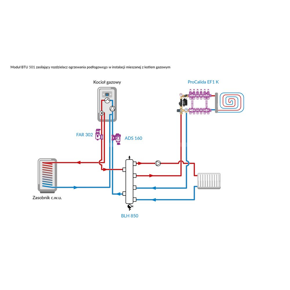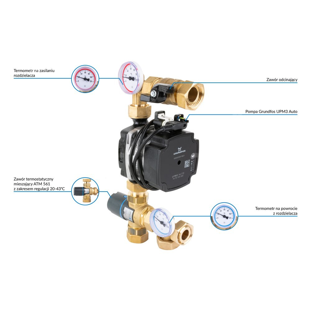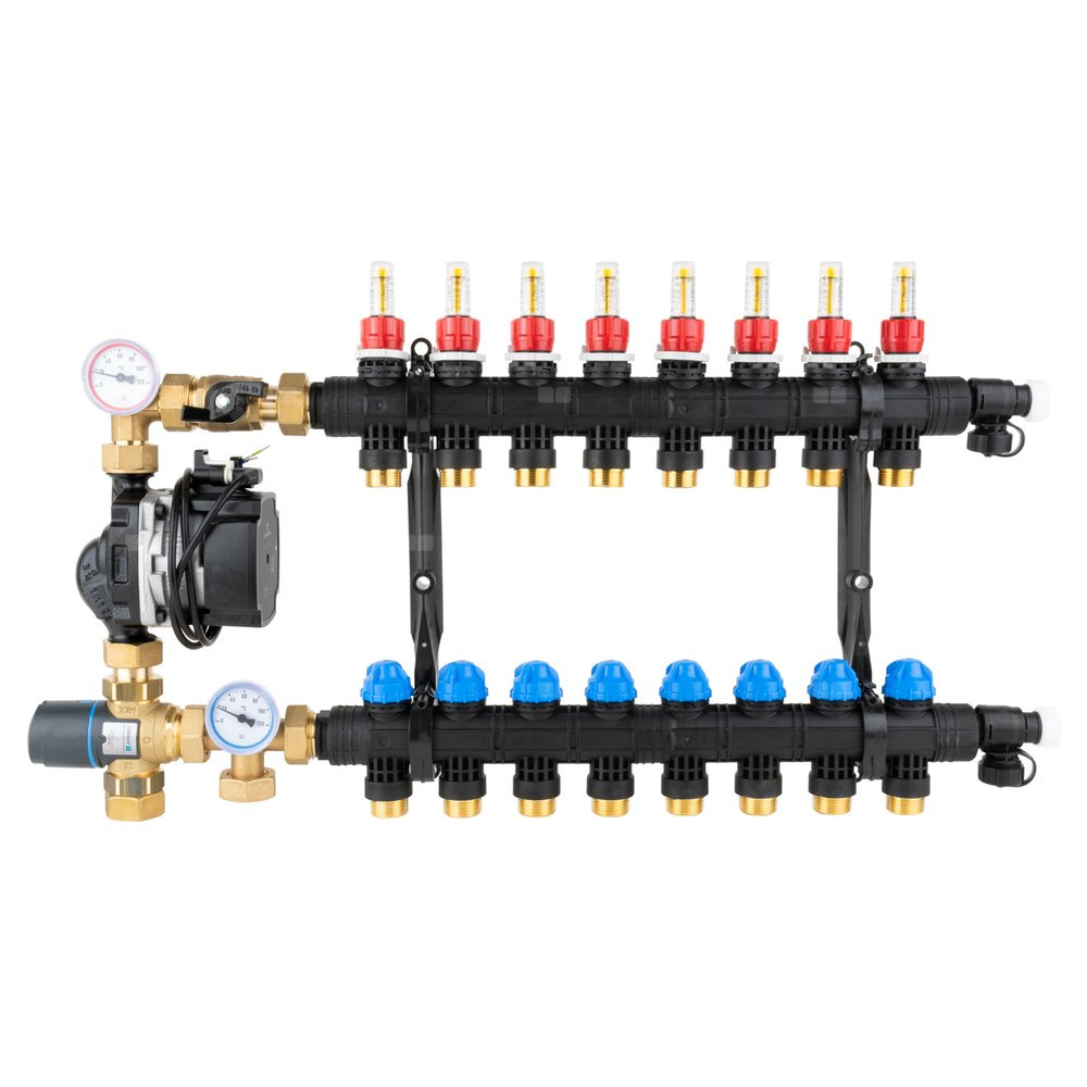 Stosowany w instalacjach grzewczych.Montowany między źródłem ciepła a rozdzielaczem ogrzewania płaszczyznowego w szafce rozdzielacza.