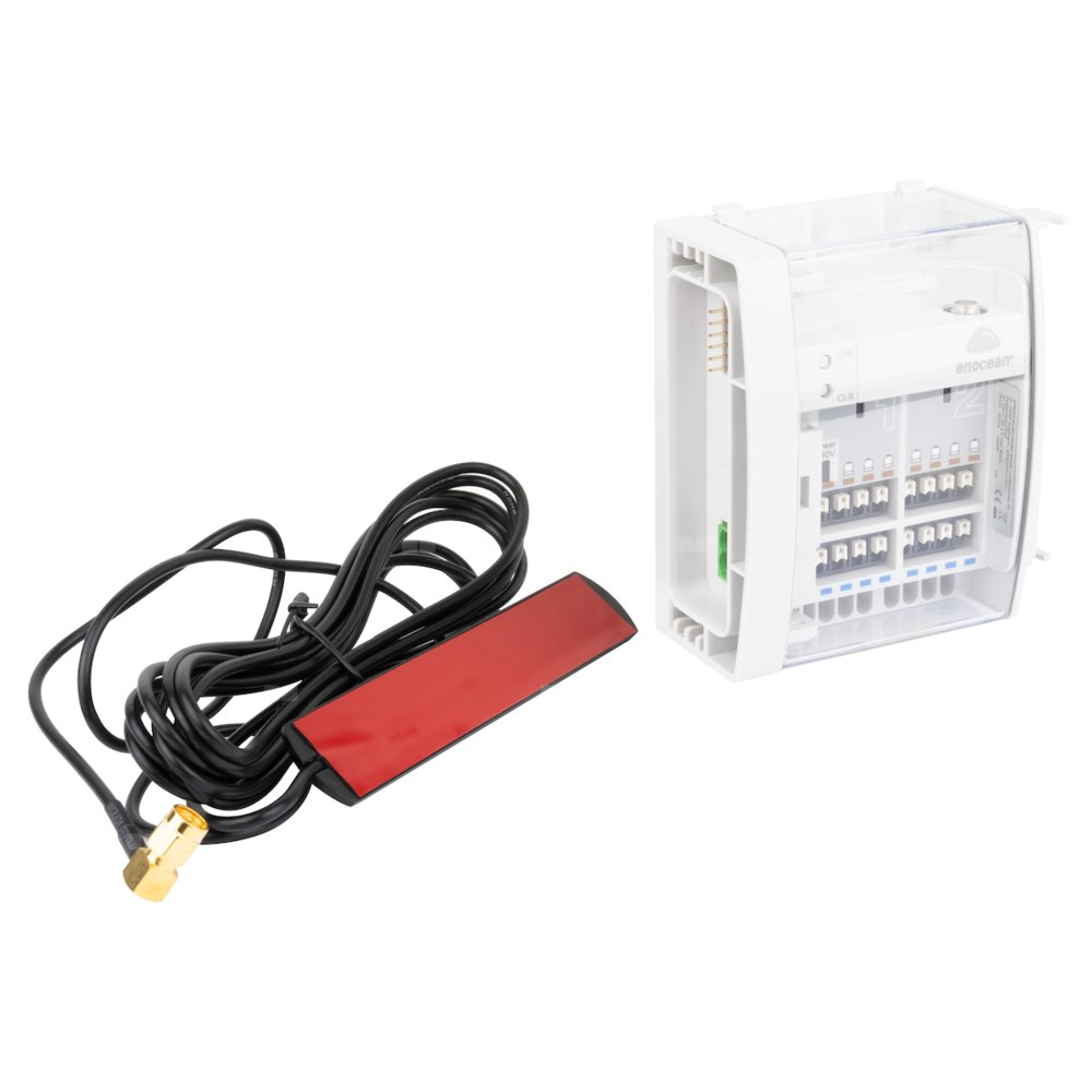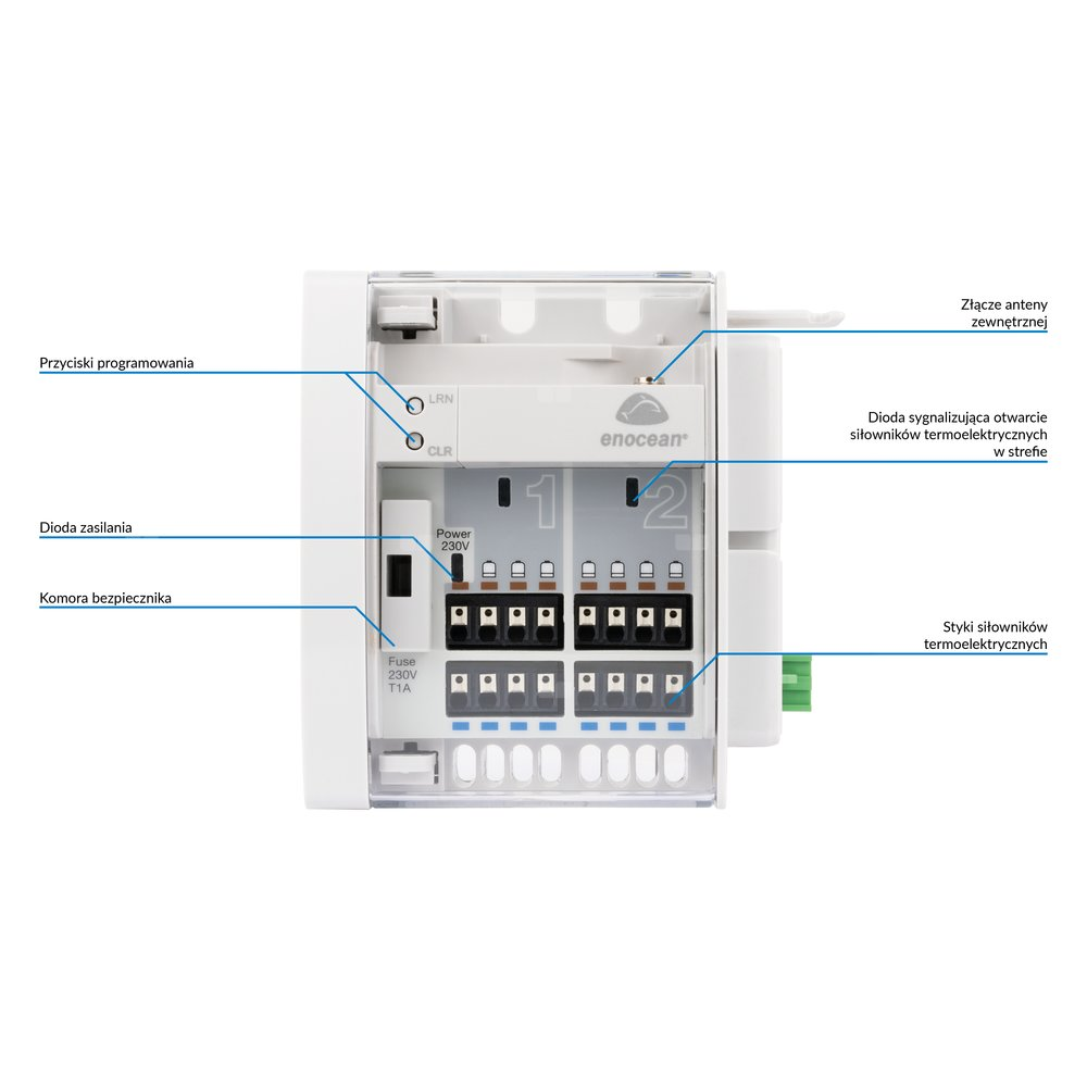 Antena zewnętrzna wyprowadza odbiornik sygnału EnOcean poza szafkę rozdzielacza, poprawiając zasięg.