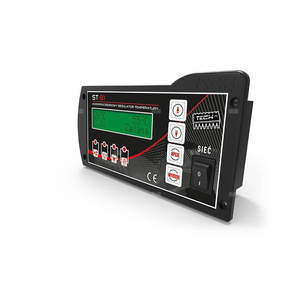 Regulator temperatury ST–81 przeznaczony jest do zasypowych kotłów CO. Steruje pompą obiegu wody CO, pompą ciepłej wody użytkowej CWU oraz wentylatorem. Do wyboru cztery tryby pracy pomp: ogrzewanie domu, priorytet bojlera, pompy równoległe, tryb letni. Obudowa sterownika dostosowana jest do montażu pod zabudowę kotła.