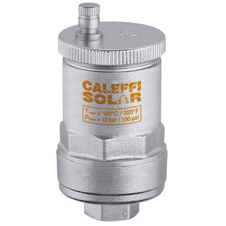 Odpowietrznik automatyczny o dużej wydajności do instalacji solarnych Przyłącze: G 1/2" (ISO 228-1) GW. Maksymalne ciśnienie pracy: 10 bar. Maksymalne ciśnienie upustowe: 10 bar. Zakres temperatury medium: -30–160 °C. Wykończenie: chromowane. Maksymalne stężenie glikolu: 50 %. Medium: Roztwory glikolu. Materiał: mosiądz.