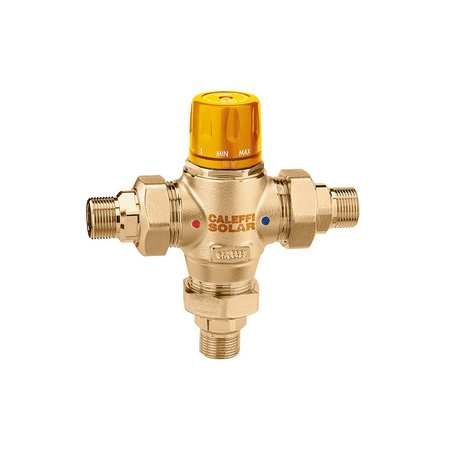 Termostatyczny zawór mieszający, z wymiennym wkładem, do instalacji solarnych Przyłącze: G 3/4" A (ISO 228-1) GZ, złączka. Maksymalne ciśnienie pracy: 14 bar. Zakres temperatury medium: 0–110 °C. Zakres regulacji temperatury: 30–65 °C. Kv: 4,5 m³/h. Materiał: mosiądz.