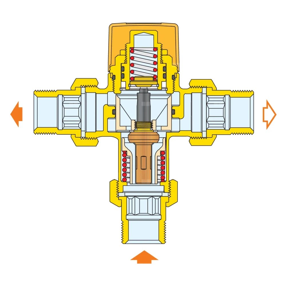 Termostatyczny zawór rozdzielający do instalacji solarnych Przyłącze: G 1/2" A (ISO 228-1) GZ. Maksymalne ciśnienie pracy: 10 bar. Zakres temperatury medium: 0–100 °C. Zakres regulacji temperatury: 35–55 °C. Kv: 1,5 m³/h. Materiał: stop mosiądzu odporny na odcynkowanie.