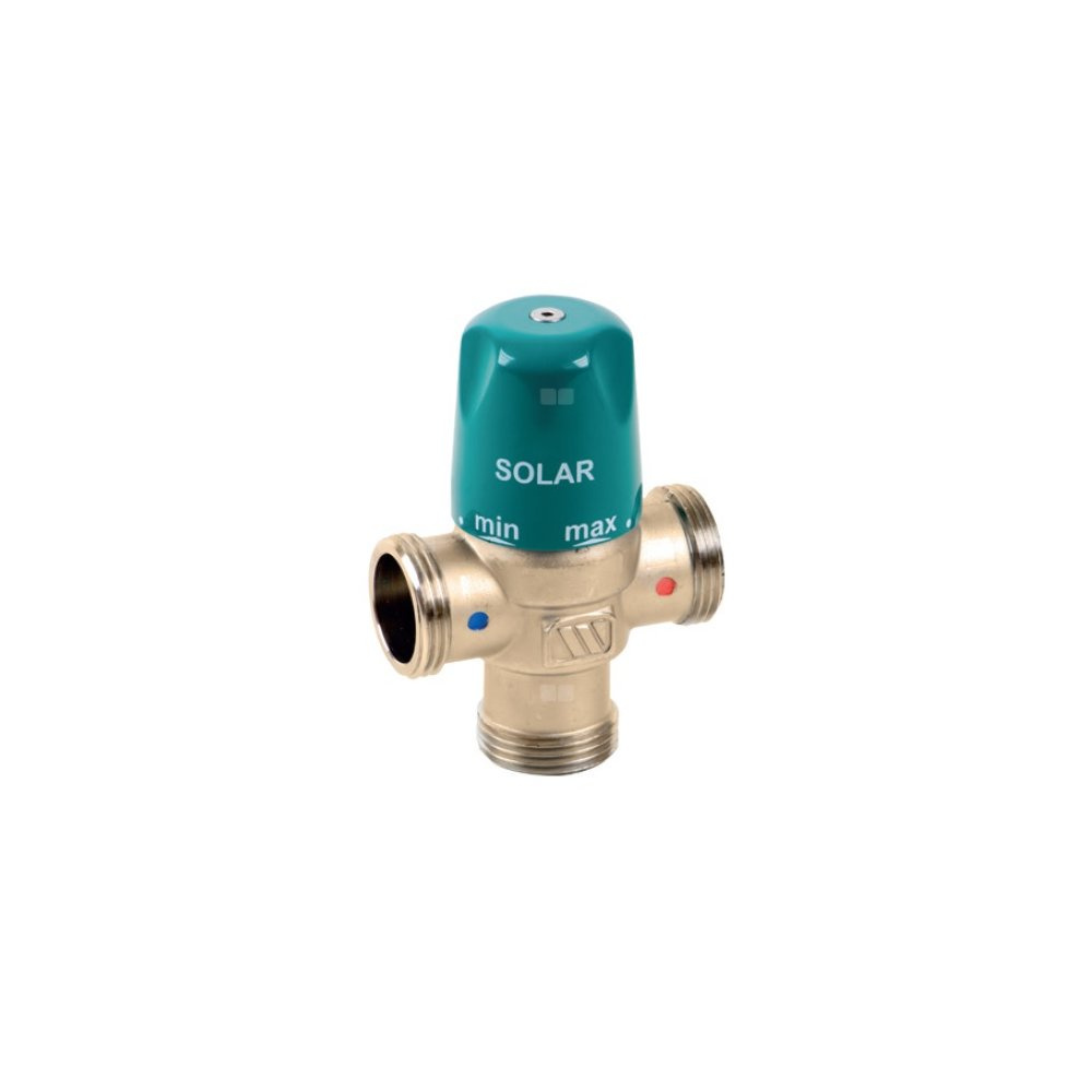 Termostatyczny zawór mieszający do instalacji solarnych, zapewnia dostarczenie wody pitnej w ustawionym zakresie 30° - 65°C. Nastawa fabryczna 50°C. Funkcja ochrony przed poparzeniem. Korpus - mosiądz lub mosiądz niklowany. Maks. temperatura z zasobnika: 110°C. Przepływ 63 l/min przy ciśnieniu 3 bar. Gwint zewnętrzny wszystkich króćców 1”, półśrubunki 1/2” - 1”. Dowolna pozycja montażowa.
