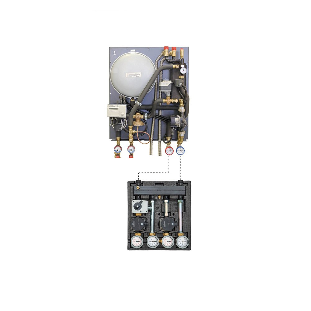 naczynia przeponowego 12 I, manometrów, termometrów, rozdzielacza, obiegu grzewczego bez mieszacza z pompą UPM3 AUTO 15-70, obiegu grzewczego z mieszaczem i pompą UPM3 AUTO 15-70, obudowy, sterownika pogodowego, izolacji.