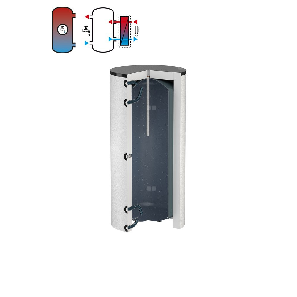 Powłoka wewnątrz zasobnika emaliowana, według normy DIN 4753 Część 3. Optymalna ochrona przed korozją poprzez zastosowanie anody magnezowej ( zasobniki do 1000l), zasobniki od 1500l posiadają anodę bezobsługową FSA.