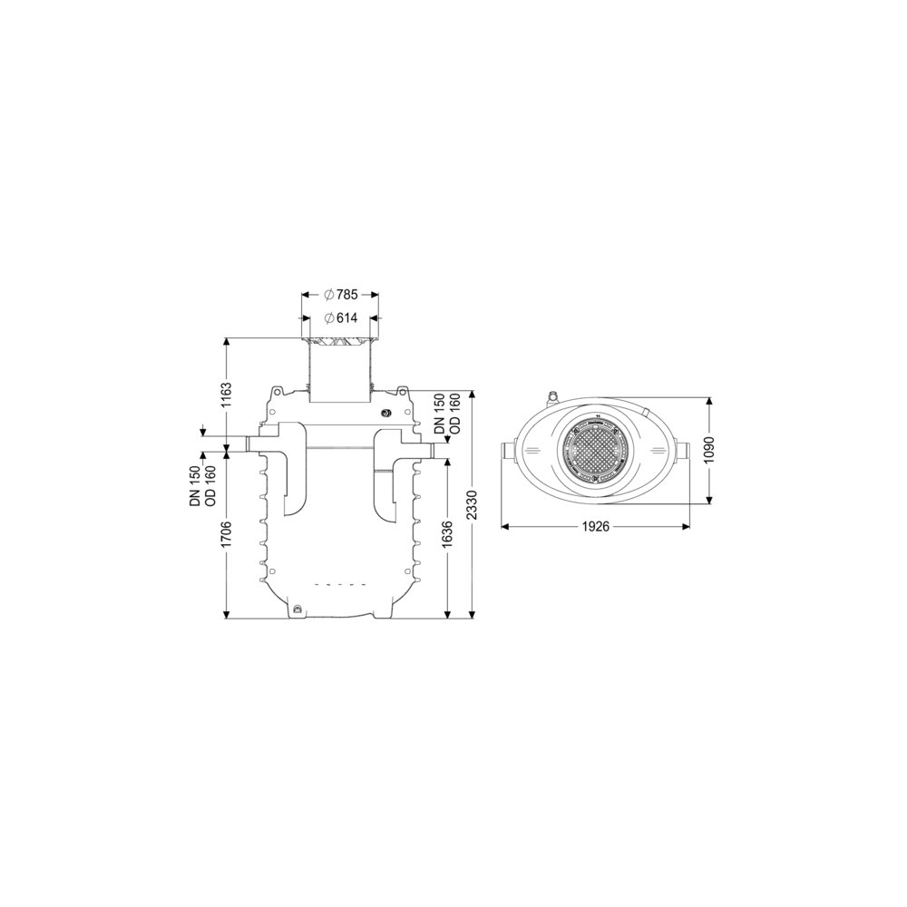 Odstęp między dnem rury odpływowej a dnem zbiornika: 1635 mm
