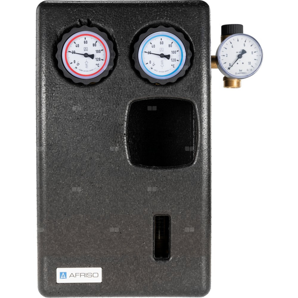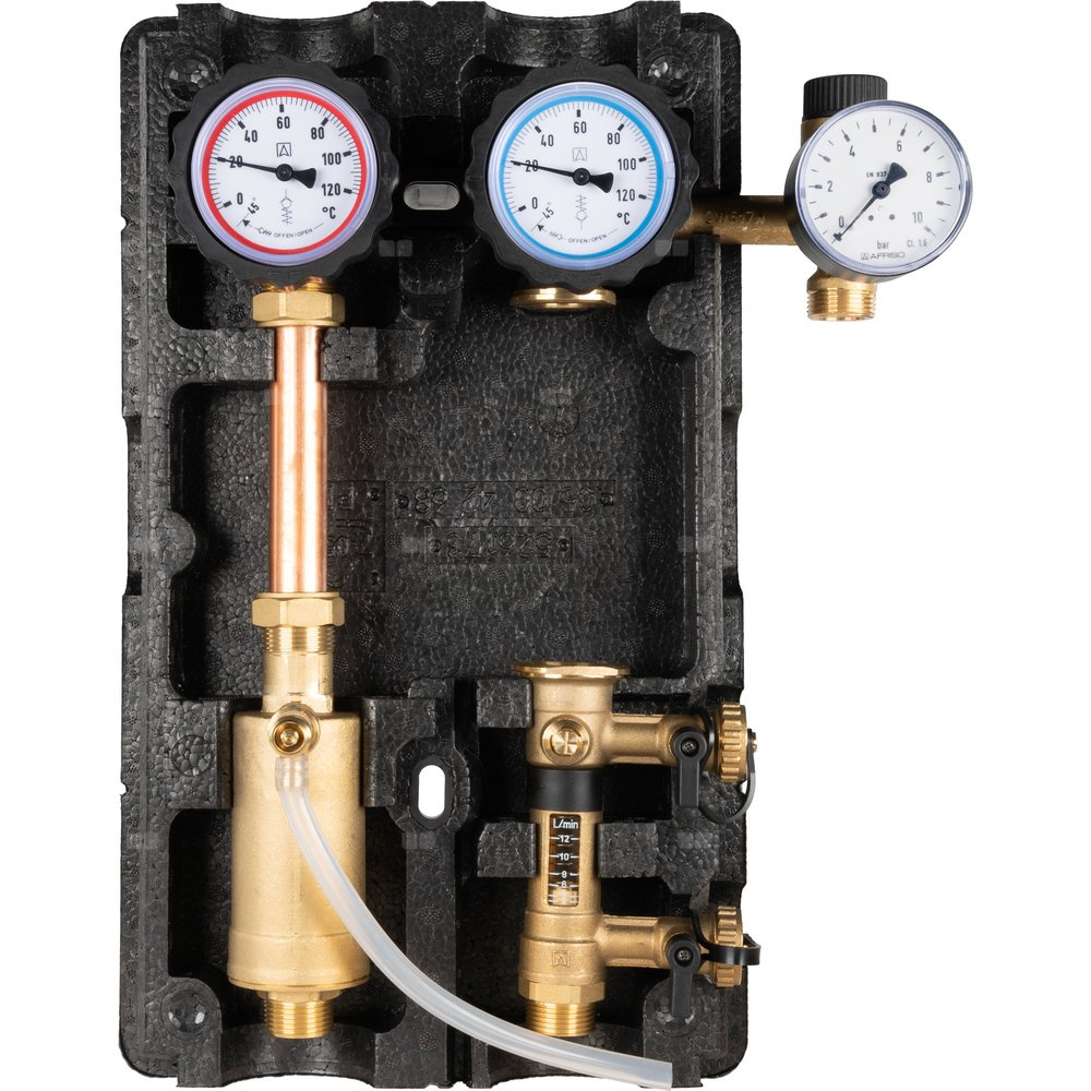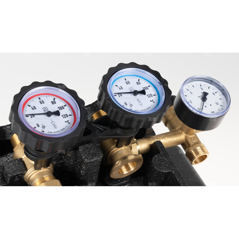 Grupa bezpieczeństwa z zaworem bezpieczeństwa o ciśnieniu otwarcia 6 bar oraz manometrem o zakresie 0-10 bar.