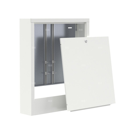 Rozdzielaczowe szafki natynkowe o głębokości 110 mm, wykonane w całości z blachy stalowej ocynkowanej o grubości 0,8 mm malowane proszkowo w kolorze RAL 9003.