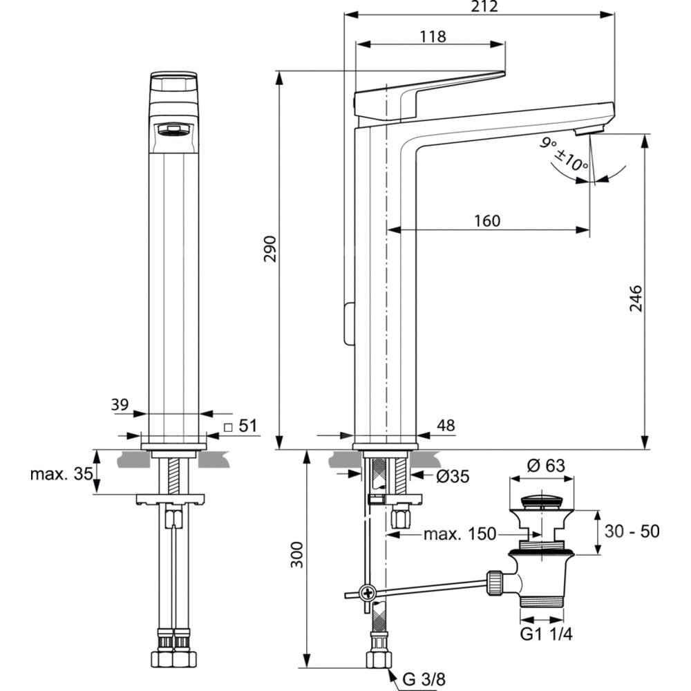 Jednootworowa wysoka bateria umywalkowa z głowicą ceramiczną 28 mm i ogranicznikiem temperatury. Mosiężny, odlewany korpus. Metalowy uchwyt z nadrukowanymi czerwonymi i niebieskimi oznaczeniami oraz metalowy automatyczny korek. Perlator typu Cascade z ogranicznikiem przepływu wody do 5 l/min i regulacją kierunku strumienia. Elastyczne węże przyłączeniowe z gwintem G3/8". System montażu EASY-FIX. Metalowy pierścień.