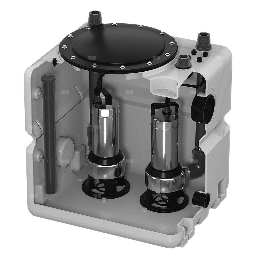 Zbiornik do zbierania ścieków do agregatu podnoszącego z układem dwóch pomp. Nadaje się do zbierania i usuwania ścieków z wnętrza budynków, tj. Piwnic / piwnic poniżej poziomu kanalizacji (uwaga: nie nadaje się do ruchu drogowego).