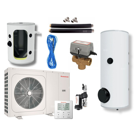 Magis M8 EH300 B100 to zestaw składający się pompy ciepła typu monoblok Magis M8 z wbudowaną grzałką o mocy 3 kW, zasobnika c.w.u. o pojemności 300l a także bufor do c.o. o pojemności 100l. Dodatkowo zestaw podłączeniowy, zawór trójdrogowy przełączający do c.w.u., sondę NTC oraz filtr magnetyczny i zestaw ochrony antyzamrożeniowej do jednostki zewnętrznej (fabrycznie zainstalowany).